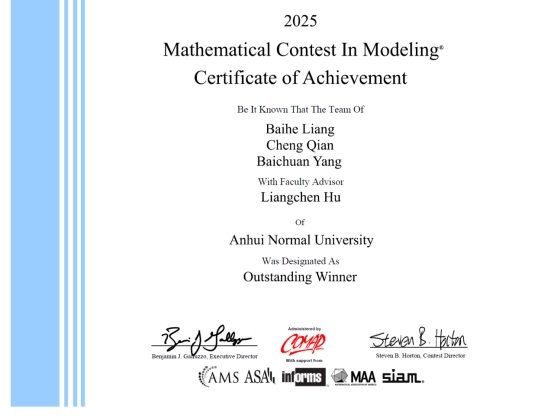 近日,2025年美国大学生数学建模竞赛(MCM/ICM)结果揭晓,计信学子在该项国际赛事中斩获殊荣,成功摘得MCM特等奖(Outstanding Winner)。此次获奖不仅为学院和学校争得荣誉,更成为安徽省今年唯一获此殊荣的队伍,实现了365英国上市网站官网在该赛事最高奖特等奖上零的突破。